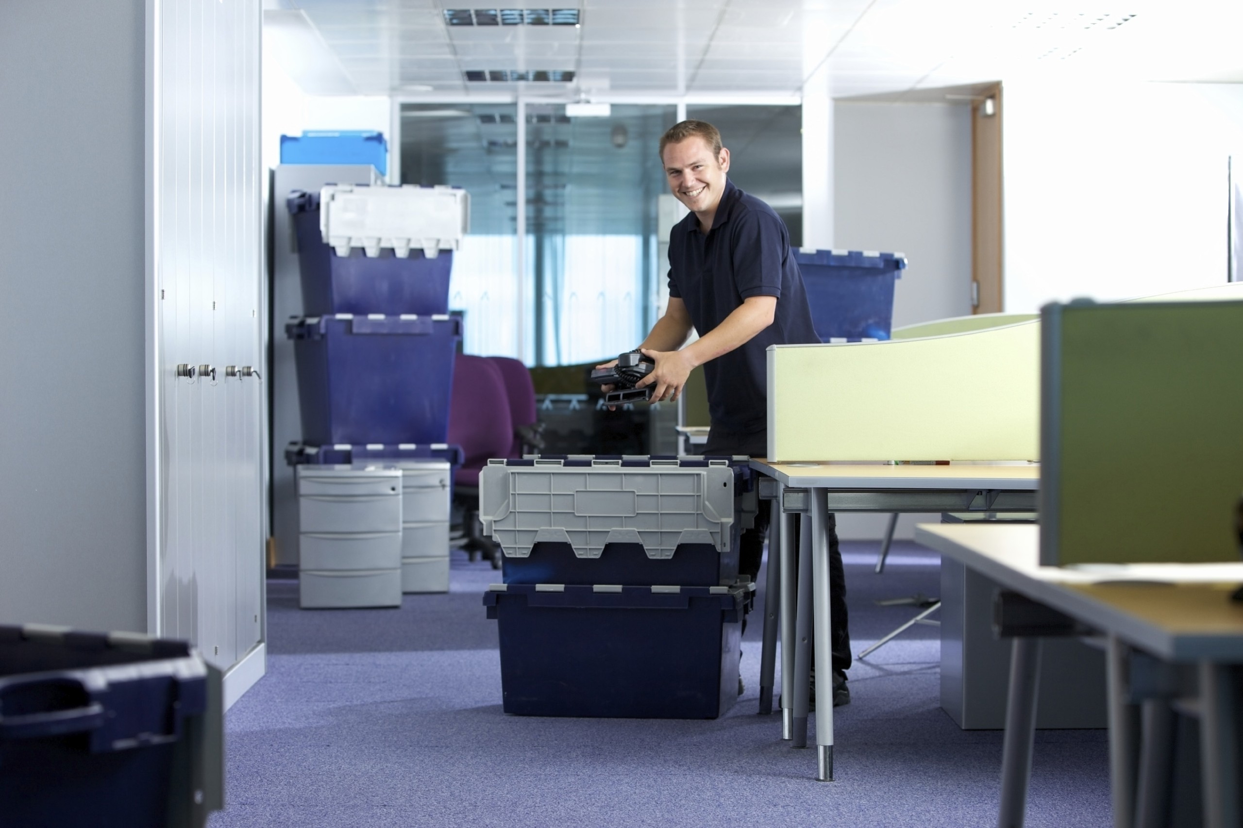 A cheerful looking removal man loading up delivery crates.
